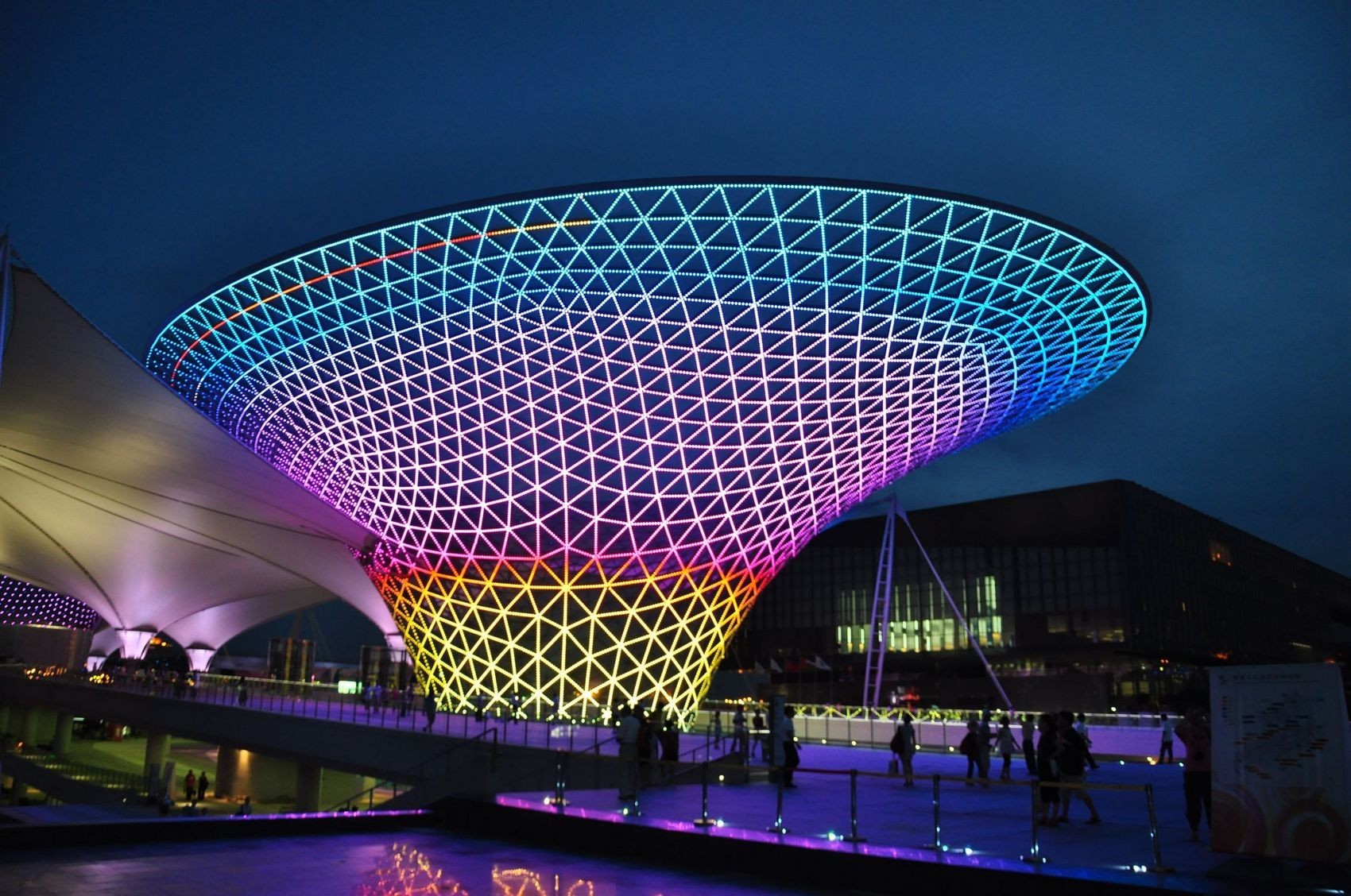 世博轴阳光谷作为世博园区“一轴四馆”永久性建筑中单体面积最大的建筑,阳光谷和水波状膜是世博源的核心建筑语言,被膜结构环绕的玻璃阳光谷形如开放的花朵,六个巨大的阳光谷撑起的顶棚的设计,将阳光、绿化和自然空气引入地下空间。它们同时也是建筑夜晚与白昼的光源,如同水晶一般将自然光引入各层,并通过地面和天花连续反射,与水面或绿地的光线游戏形成呼应。阳光谷自然的形态体现了结构力的传递,富有张力的体型如同雕塑,丰富了世博园区地面、地下空间的效果,营造出和谐的空间气氛,此次阳光谷艺术灯景观的成功营造,为世博区域、为上海城市增添和提升夜景灯光价值。