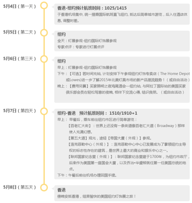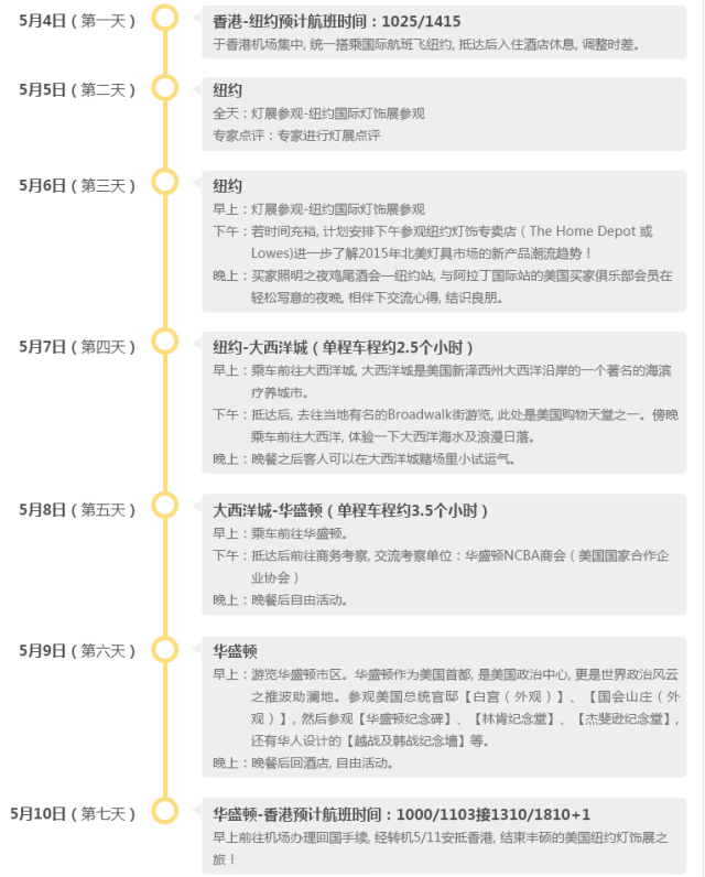 “阿拉丁2015纽约观展团”由阿拉丁国际站www.lightstrade.com承办,行程包括纽约-华盛顿-大西洋城三地,除参观展会之外,本团也将考察美国当地灯饰专门店、人文状况,并与美国买家俱乐部成员及当地商会等进行一系列商务交流;此外还有购物、海滩以及媲美拉斯维加斯的大西洋城赌场,绝对是当今行业商务人士出行的不二之选,名额有限!时间紧迫!现在就请火速加入阿拉丁2015纽约观展团!
