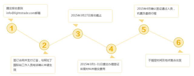 1、 报名时请填写好报名表,以收到报名表及订金为凭,报名时每人预收订金费用CNY10, 000。(注:如果拒签,需收签证服务费及邀请信费CNY2, 500)