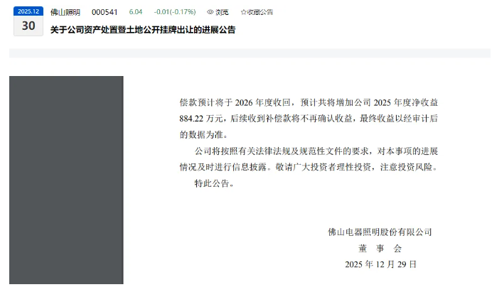 佛山照明:土地处置稳步落地 斩获第二笔补偿款 佛山照明(A 股代码:000541;B 股代码:200541)于 2025 年 12 月 29 日发布资产处置暨土地公开挂牌出让进展公告,披露了汾江北路地块相关补偿款的收取情况。 事件始于 2024 年 2 月 1 日,经公司董事会和股东大会审议通过,佛山照明与佛山市禅城区土地储备中心及佛山市禅城区祖庙街道办事处正式签署《国有土地使用权储备协议书》,约定公司完成地上建筑物拆除等前期整理工作后,将汾江北路地块逐批次交地挂账收储。2024 年 11 月 4 日,该地块南区顺利完成公开挂牌出让,公司于当年 12 月 25 日收到首笔补偿款 38,177.91 万元。 截至 2025 年 12 月,汾江北路南区地块剩余待收补偿款为 1,200 万元。2025 年 12 月 29 日,公司收到佛山市禅城区土地储备中心支付的汾江北路南区地块第二笔补偿款600 万元,剩余 600 万元补偿款预计将于 2026 年度收回。根据公告,本次收款预计将增加公司 2025 年度净收益 884.22 万元,后续收到的补偿款将不再确认收益,最终收益以经审计后的数据为准。佛山照明表示,将持续按照法律法规及规范性文件要求,及时披露该事项进展,提醒广大投资者理性投资、注意风险。