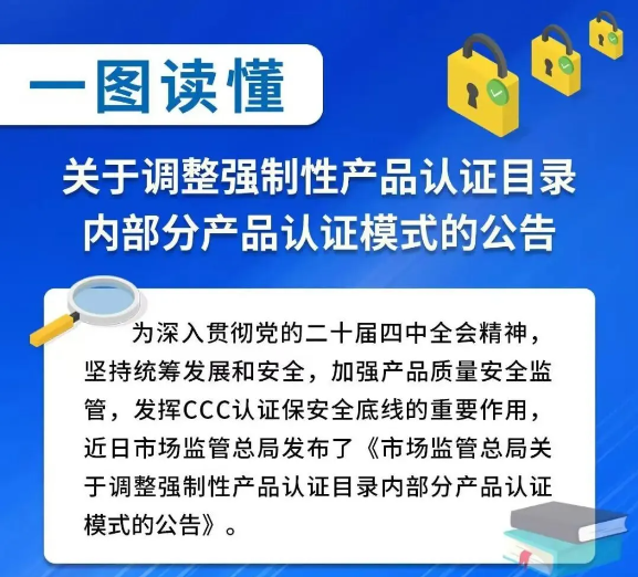 近日,市场监管总局发布《关于调整强制性产品认证目录内部分产品认证模式的公告》,对强制性产品认证(CCC认证)目录内部分产品的认证模式作出重要调整。